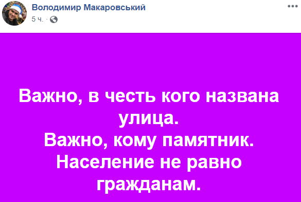 "Важно, в честь кого названа улица. Важно, кому памятник. Население не равно гражданам", - повторил тезис Яхно блогер Владимир Макаровский.