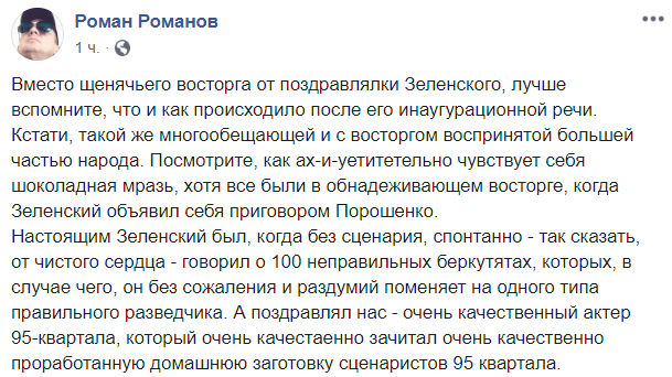 Настоящим Зеленский был, когда без сценария, спонтанно - так сказать, от чистого сердца - говорил о 100 неправильных беркутятах, которых, в случае чего, он без сожаления и раздумий поменяет на одного типа правильного разведчика. А поздравлял нас - очень качественный актер 95-квартала, который очень качестаенно зачитал очень качественно проработанную домашнюю заготовку сценаристов 95 квартала", - пишет одессит Роман Романов.