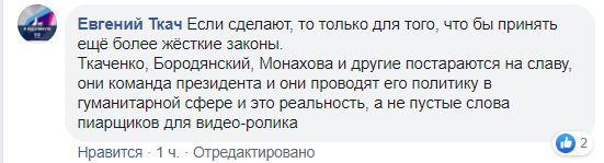 "Если сделают, то только для того, что бы принять ещё более жёсткие законы. Ткаченко, Бородянский, Монахова и другие постараются на славу, они команда президента и они проводят его политику в гуманитарной сфере и это реальность, а не пустые слова пиарщиков для видео-ролика", - отвечает на пост Игоря Гужвы Евгений Ткач.
