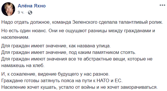 И, к сожаление, видение будущего у нас разное. Граждане готовы затянуть пояса на пути к НАТО и ЕС. Население хочет кушать, устало от войны и не хочет заморачиваться", - пишет блогер Алена Яхно.