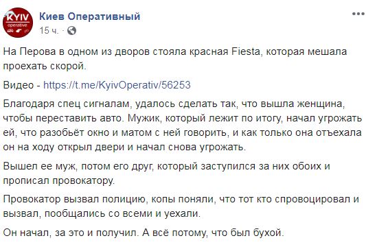 "На Перова в одном из дворов стояла красная Fiesta, которая мешала проехать скорой. Благодаря спецсигналам, удалось сделать так, что вышла женщина, чтобы переставить авто. Мужик, который лежит по итогу, начал угрожать ей, что разобьет окно и матом с ней говорить, и как только она отъехала он на ходу открыл двери и начал снова угрожать", - говорится в сообщении.