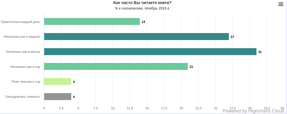 К числу более или менее регулярно читающих книги людей относят себя 43% респондентов. Склонность украинцев к чтению книг в определенной мере зависит от их пола, возраста и уровня образования. Женщины читают книги больше, чем мужчины (соответственно, 47% против 38%).