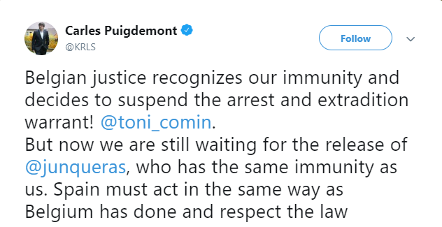 "Бельгийское правосудие признает наш с Тони Комином иммунитет и решает приостановить ордер на арест. Но сейчас мы ждем освобождения Ориола Жункераса (бывшего вице-президента Каталонии - Ред.), Который имеет такой же иммунитет, как и мы. Испания должна действовать так, как это сделала Бельгия, и уважать закон ", - написал он.