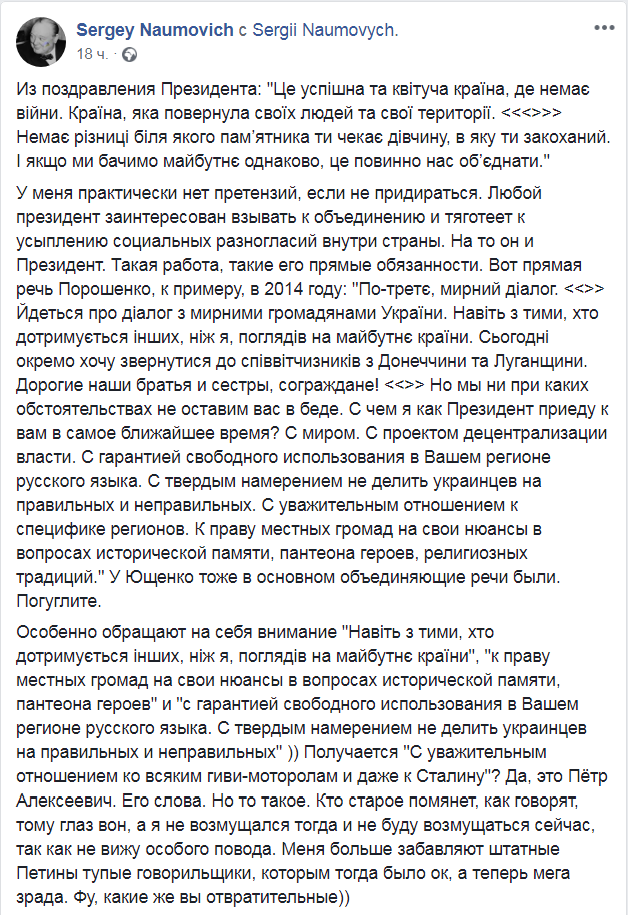 "Да, это Петр Алексеевич. Его слова. Но то такое. Кто старое помянет, как говорят, тому глаз вон, а я не возмущался тогда и не буду возмущаться сейчас, так как не вижу особого повода. Меня больше забавляют штатные Петины тупые говорильщики, которым тогда было ок, а теперь мега зрада", - резюмирует Наумович.