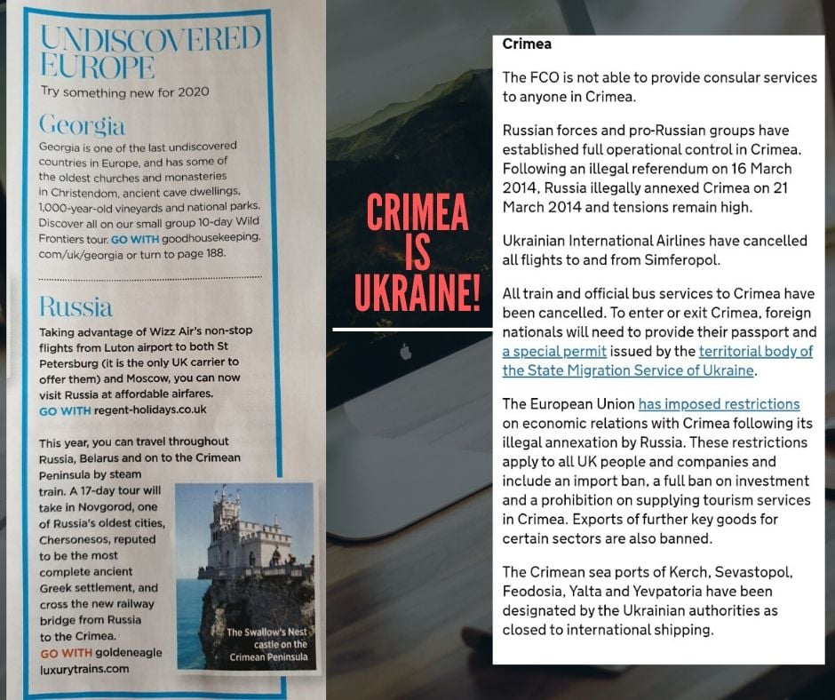 В очерке журнала под названием "Неизведанная Европа: попробуй что-то новое в 2020 году", фото которого опубликовало украинское посольство в Великобритании, рассказывается о том, как можно попасть в Крым на поезде через Россию по недавно открытому Керченском мосту. Иллюстрируется статья фотографией Ласточкиного гнезда - крымского архитектурного памятника.