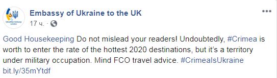 "Good Housekeeping, не вводите в заблуждение своих читателей! Бесспорно, Крым стоит того, чтобы войти в рейтинг исследований самых горячих направлений 2020 года, но это территория под военной оккупацией", - говорится в сообщении.