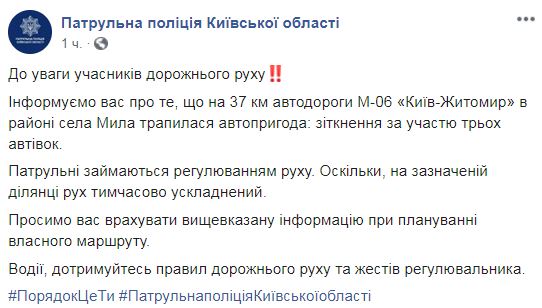 Отмечается, что на указанном участке патрульные полицейские регулируют движение транспорта. "Информируем вас о том, что на 37 км автодороги М-06 "Киев-Житомир" в районе села Мила случилась авария: столкновение с участием трех автомобилей. Патрульные занимаются регулировкой движения. Так, на указанном участке движение временно затруднено", - говорится в сообщении.