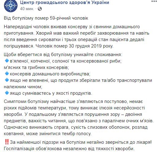 "От ботулизма умер 59-летний мужчина. Накануне мужчина употреблял консервы из свинины домашнего приготовления. Больной имел тяжелое течение заболевания и даже после введения сыворотки и трех операций состояние пациента все ухудшалось. Мужчина умер 30 декабря 2019 года", - говорится в сообщении. В ЦОЗ не сообщают, в каком регионе страны произошла трагедия.