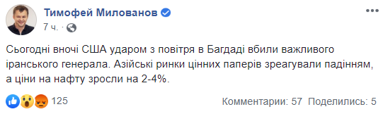"Сегодня ночью США ударом с воздуха в Багдаде убили важного иранского генерала. Азиатские рынки ценных бумаг отреагировали падением, а цены на нефть выросли на 2-4%", - написал он на своей странице в Facebook.