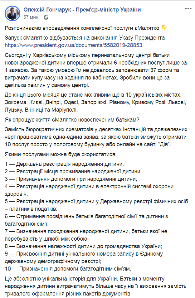 В Харькове началось внедрение комплексной услуги еМалыш (еМалятко), которая до конца января появится еще в 10 городах. Об этом в своем Facebook сообщил премьер-министр Украины Алексей Гончарук.