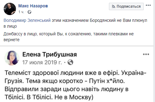 "Владимир Зеленський этим назначением Бородянский не Вам плюнул в лицо. Донбассу в лицо, который Вы, к сожалению, такими плевками не вернете" - поделился одним из постов Трибушной ведущий Макс Назаров.