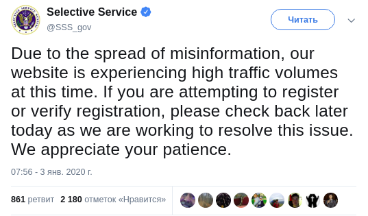 "Из-за распространения дезинформации наш сайт в настоящее время переживает высокие объемы трафика. Если вы пытаетесь зарегистрироваться или подтвердить регистрацию, пожалуйста, попробуйте сделать это позже сегодня, поскольку мы работаем над решением этой проблемы. Мы ценим ваше терпение", - сообщила призывная служба в своем Twitter.