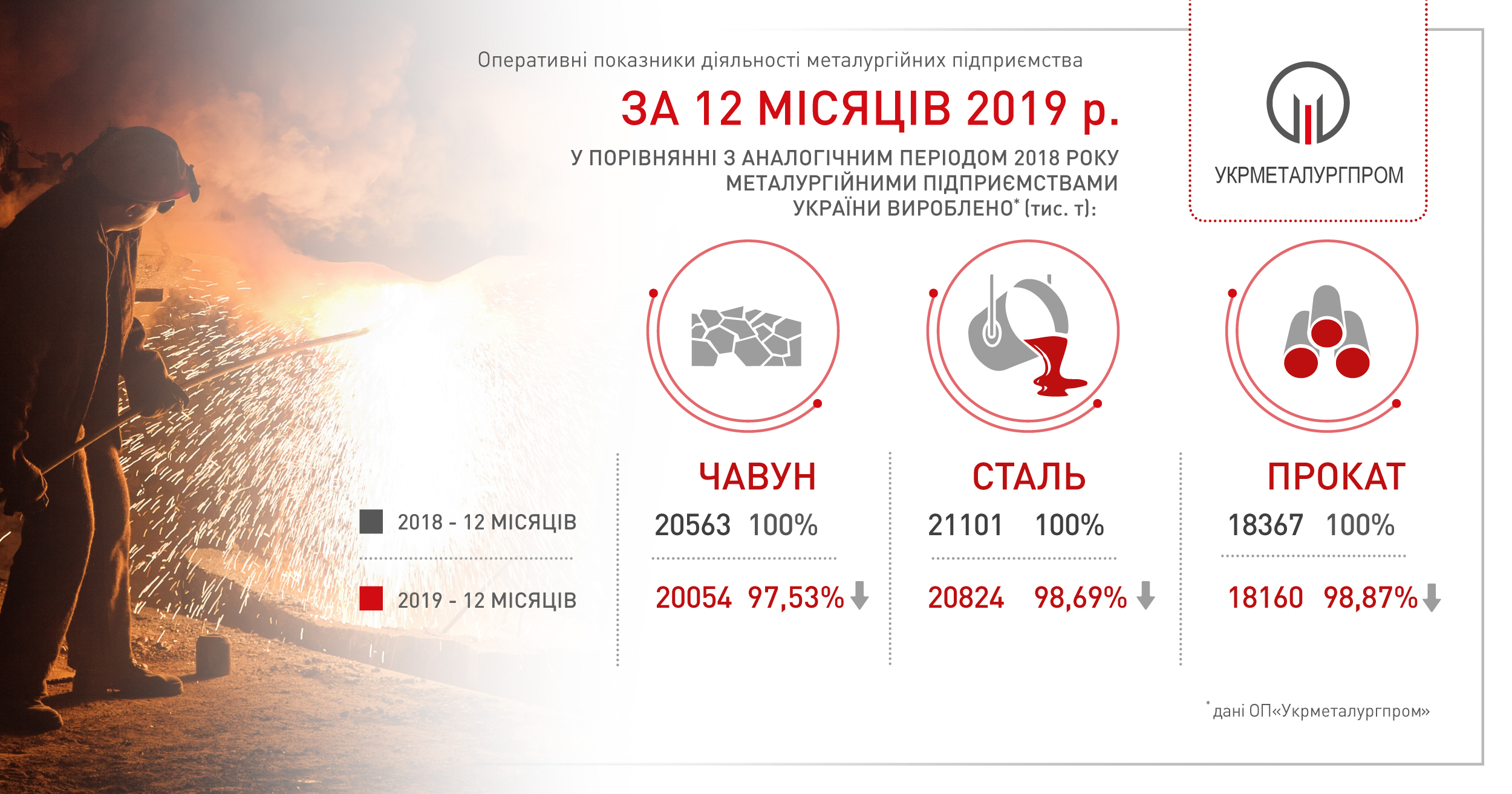 Так, за прошлый год в Украине было произведено 20,05 млн тонн чугуна (97,53% относительно 2018 года), 20,82 млн тонн стали (98,69%), а также 18,16 млн тонн проката (98,87%).