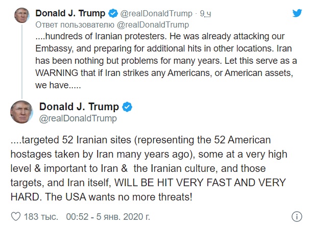 "Пусть это послужит предупреждением, что, если Иран нанесет удар по американцам или американскому имуществу, мы нацелены на 52 позиции в Иране (в соответствии с 52 американскими заложниками, захваченными Ираном много лет назад), некоторые высокого уровня и значимые для Ирана и иранской культуры, и эти цели, как и сам Иран, подвергнутся быстрому и сильному удару. США более не хотят каких-либо угроз", — написал президент США.