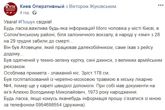 "Пожалуйста, важна любая информация! Моего мужа в Киеве, в Соломенском районе, возле железнодорожного вокзала, в народе в "яме" с 28 на 29 декабря забили до смерти... Он был Атовецем, который работал дальнобойщиком, только ехал с рейса домой... Был одет в темно-зеленую куртку, синие джинсы, с большим армейским рюкзаком. Особая примета - сломанный нос. Рост 178 см. Был госпитализирован с черепно-мозговой травмой в городскую больницу №4, умер еще в карете скорой помощи. При себе имел документы на имя Алехно Владимир Николаевич, 1973 года рождения", - написано в сообщении.