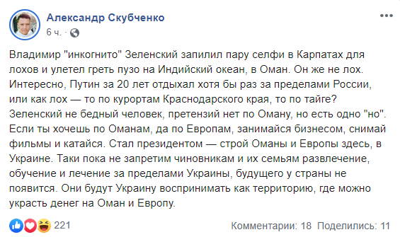 "Зеленский не бедный человек, претензий нет по Оману, но есть одно "но". Если ты хочешь по Оманам, да по Европам, занимайся бизнесом, снимай фильмы и катайся. Стал президентом – строй Оманы и Европы здесь, в Украине. Таки пока не запретим чиновникам и их семьям развлечение, обучение и лечение за пределами Украины, будущего у страны не появится. Они будут Украину воспринимать как территорию, где можно украсть денег на Оман и Европу", – пишет Скубченко.