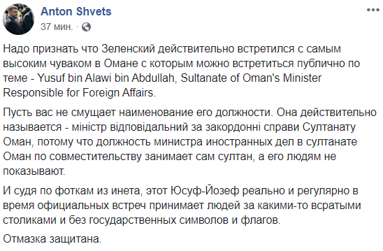 "Надо признать, что Зеленский, действительно, встретился с самым высоким чуваком в Омане, с которым можно встретиться публично по теме - Yusuf bin Alawi bin Abdullah, Sultanate of Oman's Minister Responsible for Foreign Affairs.