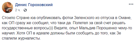 "Стоило Стране.юа опубликовать фотки Зеленского из отпуска в Омане, как ОП сразу же сообщил, что таки да. Полетел за свой счет решать государственные вопросы. Видите, опыт Мальдив Порошенко чему-то научил. Хотя ОП в идеале должны были сообщить до того, как Зе спалили журналисты", – считает блогер Денис Гороховский.