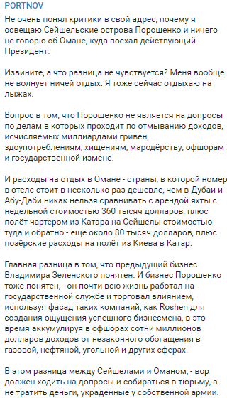 Впрочем, юрист Андрей Портнов считает, что отдых Зеленского в Омане нельзя сравнивать с нынешним отдыхом Порошенко на Сейшелах.