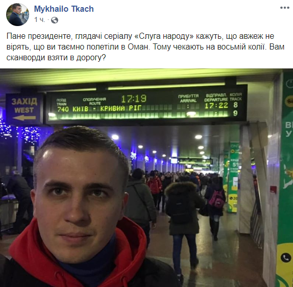 "Господин президент, зрители сериала "Слуга народа" говорят, что, конечно, не верят, что вы тайно полетели в Оман. Поэтому ждут на восьмом пути. Вам сканворды взять в дорогу?", – иронизирует журналист Михаил Ткач и публикует фото с железнодорожного вокзала на фоне времени отправления поезда на Кривой Рог.