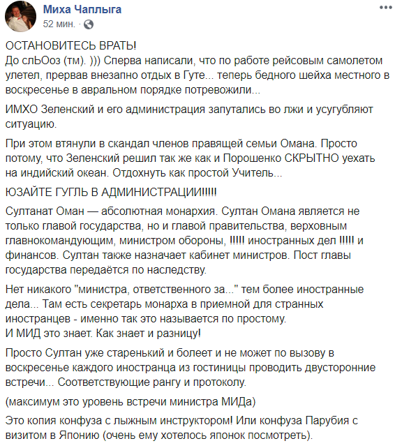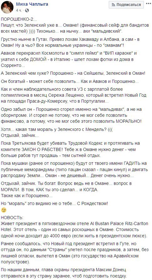 Пока мушаки (ранее от порошенко) будут от твоего имени ГАДИТЬ на публичные меморандумы (типо пацан сказал – пацан кинул) и двигать распродажу Земли... Оман – не дешевый... Денег очень нужно... Отдыхай, зайчик. Ты богат. Вопрос ведь не в Омане... вопрос в МОРАЛИ. В том, КАК ты это сделал... и КОГДА. Так же, как и Порошенко... Но "мораль" это, видимо, не о тебе... С Рождеством!" – "поздравил" президента политолог Михаил Чаплыга.