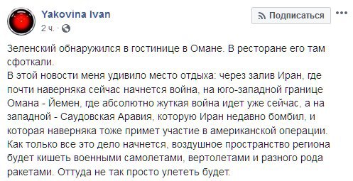 "Зеленский обнаружился в гостинице в Омане. В ресторане его там сфоткали. В этой новости меня удивило место отдыха: через залив – Иран, где почти наверняка сейчас начнется война, на юго-западной границе Омана – Йемен, где абсолютно жуткая война идет уже сейчас, а на западной – Саудовская Аравия, которую Иран недавно бомбил и которая наверняка тоже примет участие в американской операции. Как только все это дело начнется, воздушное пространство региона будет кишеть военными самолетами, вертолетами и разного рода ракетами. Оттуда не так просто улететь будет", – подчеркивает журналист.