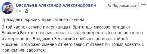 "Президент Украины очень смелый человек. В то время как всякие американцы и британцы массово покидают Ближний Восток, опасаясь попасть под перекрестный огонь иранцев и американцев, Владимир Зеленский прибыл в регион с тайной миссией. Возможно, именно от него зависит, станет ли Трамп воевать с Ираном или забоится", – иронизирует журналист.