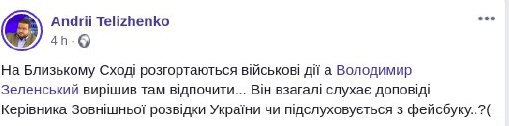 "На Ближнем Востоке разворачиваются военные действия, а Владимир Зеленский решил там отдохнуть ... Он вообще слушает доклады руководителя Внешней разведки Украины или прислушивается к Фейсбуку..?("