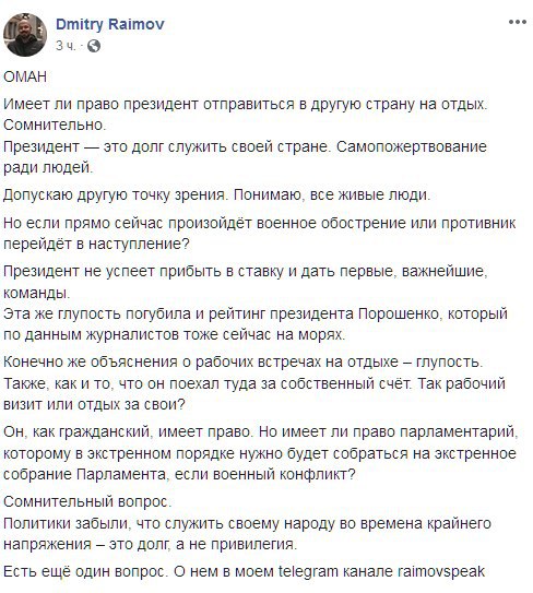 Директор и основатель Свободной школы журналистики Дмитрий Раимов говорит о том, что должность президента – долг, а не почесть и что глава государства не может улетать на такой дорогой отдых тогда, когда идет война на востоке Украины.