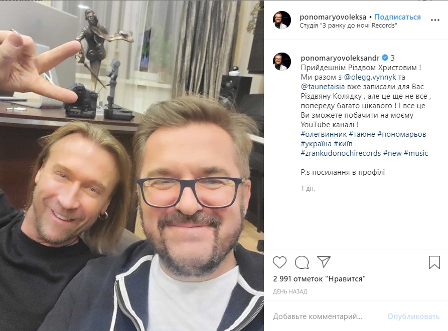 "С наступающим Рождеством Христовым! Мы с Олегом Винником и Таисией Таюне уже записали для вас рождественские колядки, но это еще не все, впереди много интересного! И все это вы сможете увидеть в моем YouTube канале", - написал Александр Пономарев на своей странице в Instagram.