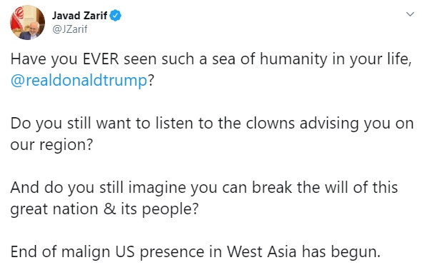 "Видели ли вы когда-нибудь такое человеческое море в своей жизни, Дональд Трамп? Вы все еще хотите слушать клоунов, которые консультируют вас по нашему региону? Вы все еще думаете, что можете сломать волю этой великой страны и ее народа? Конец преступного присутствия США в Западной Азии начался", - написал министр иностранных дел Ирана Мохаммад Джавад Зариф в своем Twitter, опубликовав фото из Тегерана.