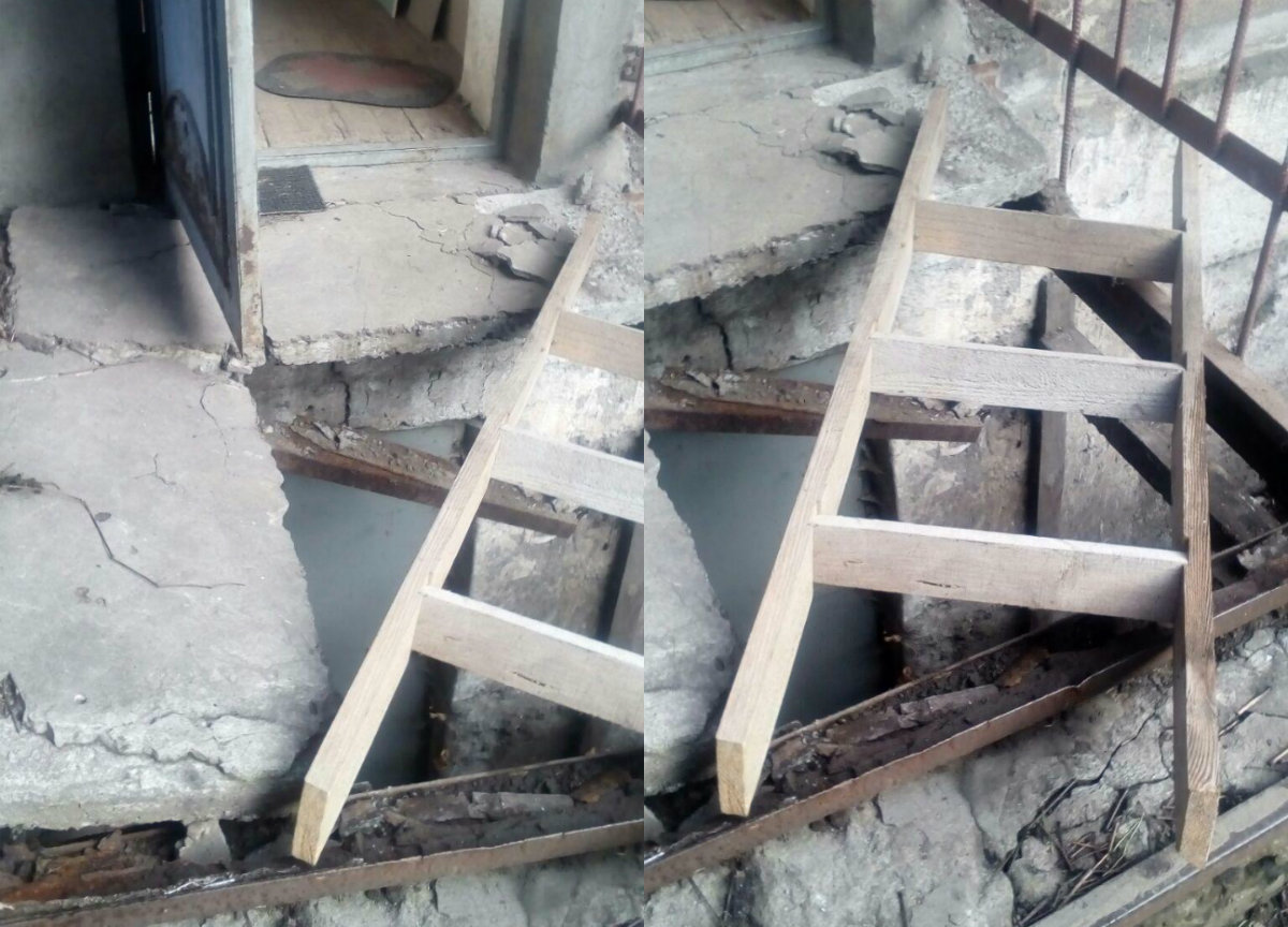 Однако даже после этой ситуации аварийный участок ответственные лица в порядок так и не привели - место, где раньше находилась плита, местные жители закрыли лестницей (чтобы хоть как-то выбираться из подъезда).