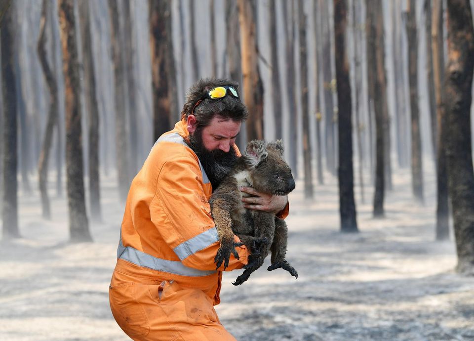В сети появилась фотография пожарного из Австралии, который выносит из обожженную в лесном пожаре коалу.