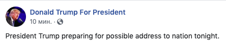 Сам Трамп на своей странице в Facebook анонсировал вечернее обращение к нации.