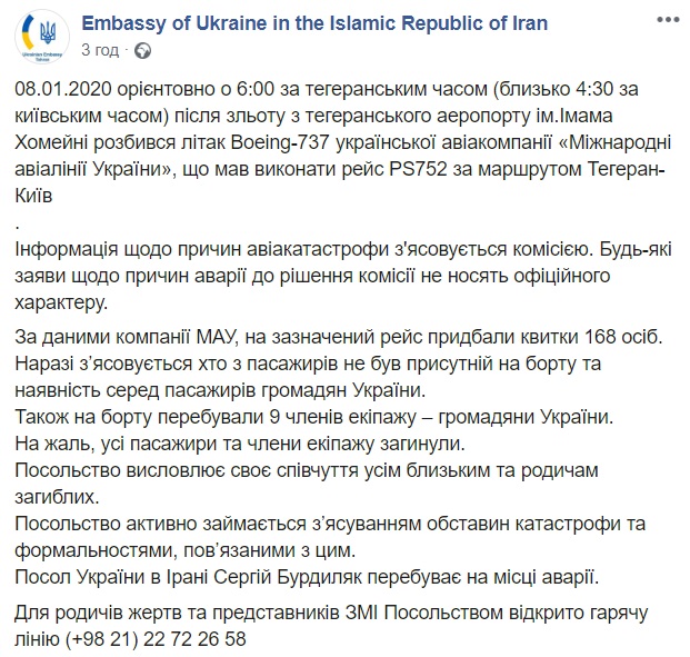 Посольство Украины в Иране изменило сообщение о крушении самолета МАУ Boeing 737-800 в Тегеране на своем сайте и в Facebook.