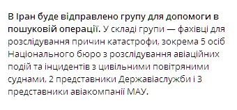 "В Иран будет отправлена группа для помощи в поисковой операции. В составе группы - специалисты для расследования причин катастрофы, в том числе 5 человек Национального бюро по расследованию авиационных происшествий и инцидентов с гражданскими воздушными судами, 2 представителя Госавиаслужбы и 3 представителя авиакомпании МАУ", - говорится в сообщении.