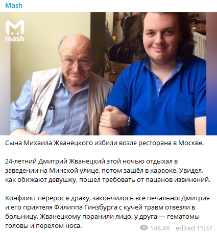 24-летнего Дмитрия Жванецкого избили возле московского ресторана. Сын сатирика вместе со своим другом Филиппом Гинзбургом отдыхали в ресторане. Друзья решили зайти в караоке, но увидели, как парни обижают девушку, и решили вмешаться. Все закончилось дракой, Дмитрия и Филиппа отвезли в больницу. У Жванецкого травмирована нога, у Гинзбурга - гематомы головы и перелом носа.