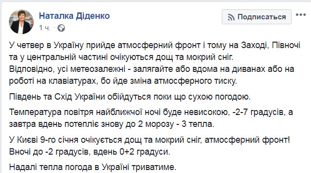 В Киеве 9 января ожидаются дождь и мокрый снег и уже упомянутый атмосферный фронт. Ночью температура упадет до -2, днем будет ​​0...+2 градуса Цельсия.