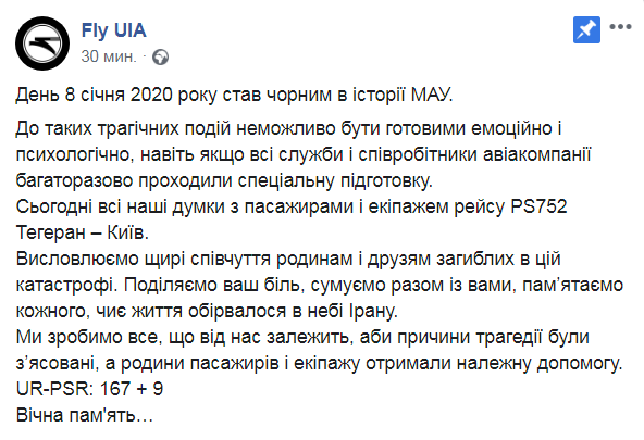 "День 8 января 2020 года стал черным в истории МАУ. К таким трагическим событиям невозможно быть готовыми эмоционально и психологически, даже если все службы и сотрудники авиакомпании неоднократно проходили специальную подготовку. Сегодня все наши мысли с пассажирами и экипажем рейса PS752 Тегеран - Киев", - сказано в записи пресс-службы МАУ.