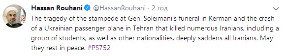 "Трагедия давки на похоронах генерала Сулеймани в Кермане и крушение украинского пассажирского самолета в Тегеране, в результате которого погибло множество иранцев, включая группу студентов, а также представителей других национальностей, глубоко огорчают всех иранцев. Пусть они покоятся с миром", - сказал он.