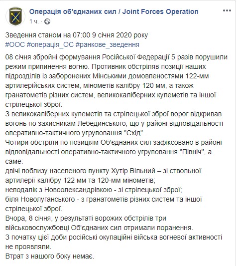 "8 января вооруженные формирования Российской Федерации 5 раз нарушили режим прекращения огня. В результате вражеских обстрелов три военнослужащие Объединенных сил получили ранения", - говорится в сообщении на официальной странице штаба ООС в соцсети Фейсбук в четверг утром.