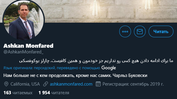 Судя по описанию аккаунта и его фото в Твиттере, Ashkan Monfared - житель США. В его Facebook говорится, что этот человек живет в городе Сан-Хосе (Калифорния). Однако ни в одной его социальной сети нет ни одного личного фото, кроме заставочного.