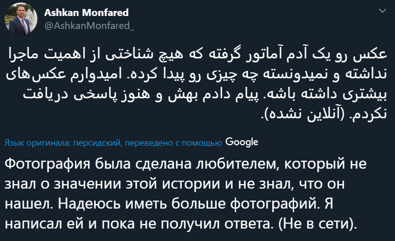 После многочисленных вопросов пользователей Ашкан ответил им, что фото было сделано людьми в Иране, которые ему и прислали снимок. "Надеюсь иметь больше фотографий", - заявил он.