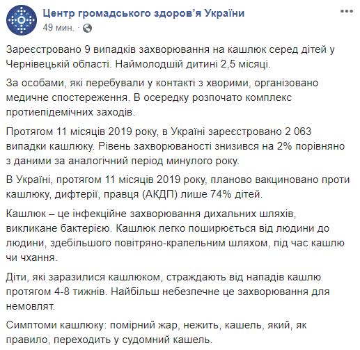В Черновицкой области зарегистрировано девять случаев заболевания коклюшем среди детей, самому младшему - 2,5 месяца. Об этом сообщает пресс-служба Центра общественного здоровья.