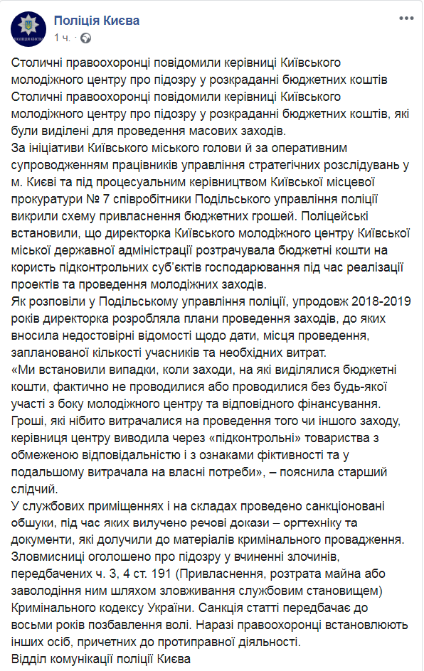 Сотрудники Подольского районного управления полиции Киева сообщили руководительнице Киевского молодежного центра столичной городской государственной администрации о подозрении в хищении бюджетных средств.
