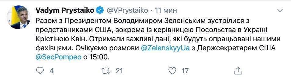 По его словам, во время встречи были получены важные данные, которые будут обработаны украинскими специалистами. Также Пристайко отметил, что сегодня в 15:00 он вместе с президентом поговорят с Госсекретарем США Майком Помпео.