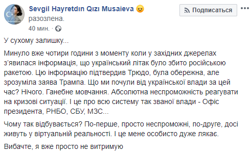 "В сухом остатке ... Прошло уже 4:00 с момента, когда в западных источниках появилась информация, что украинский самолет был сбит российской ракетой. Эту информацию подтвердил Трюдо, была осторожна, но поняла заявление Трампа. Что мы услышали от украинской власти за это время? Ничего. Позорное молчание. Абсолютная неспособность реагировать на кризисные ситуации. И это о всей системе так называемой власти - Офис президента, СНБО, СБУ, МИД ...
