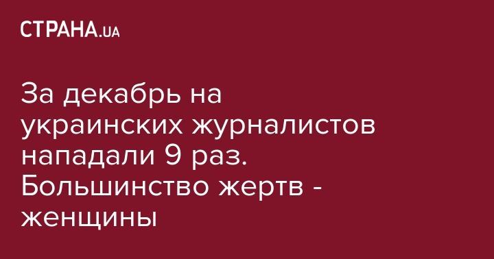 В декабре 2019 года было зафиксировано 9 инцидентов с применением силы против работников медиа. Чаще всего насилие против журналистов применялось в Киеве - 7 случаев, а также во Львове и области – 2. Среди пострадавших больше всего женщин - пять журналисток стали жертвами атак.
