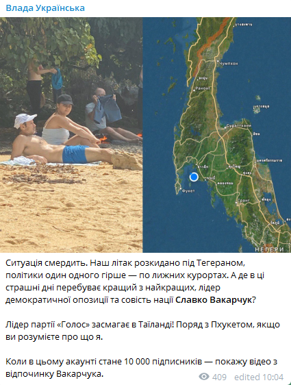 "Ситуация воняет. Наш самолет разбросано под Тегераном, политики друг друга хуже - по лыжных курортах. А где в эти страшные дни находится лучший из лучших, лидер демократической оппозиции и совесть нации Славко Вакарчук? Лидер партии "Голос"  загорает в Таиланде! Рядом с Пхукетом, если вы понимаете о чем я", - говорится в сообщении.