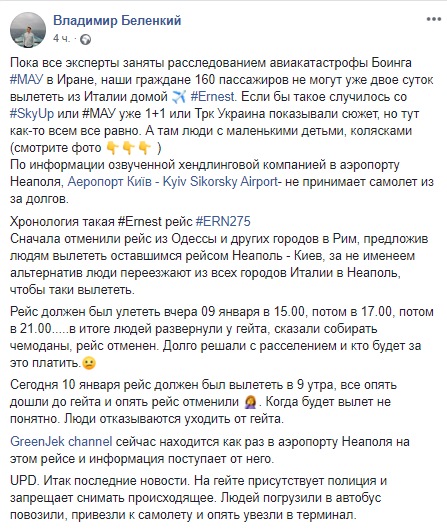"Наши граждане – 160 пассажиров – не могут уже двое суток вылететь из Италии домой... По информации, которую озвучила хендлинговая компания в аэропорту Неаполя, Международный аэропорт "Киев" им. Игоря Сикорского не принимает самолет из-за долгов...", - написал он в фейсбуке.
